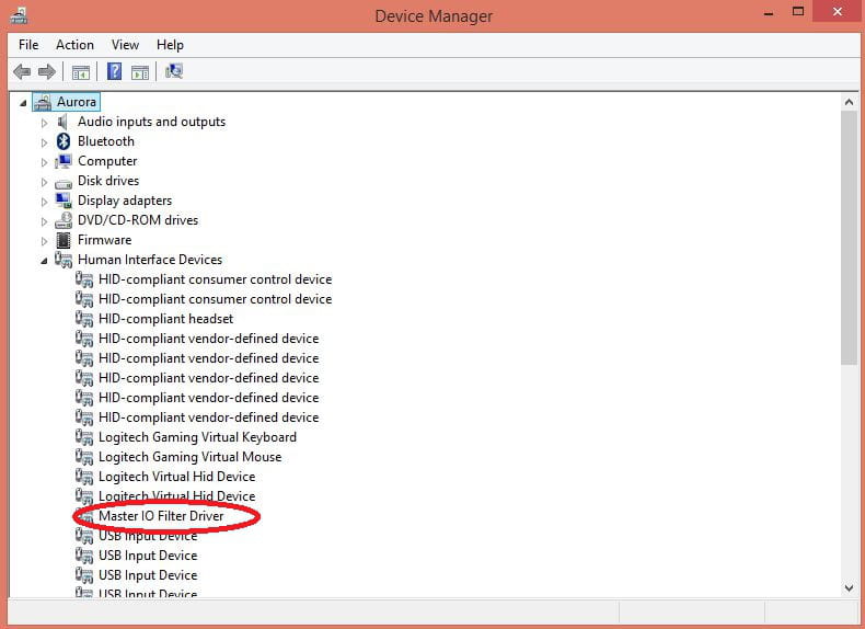 Je vous propose premièrement de désinstaller « Alienware Command Center » à partir du « panneau de configuration », ensuite allez sur « gestionnaire de périphérique » et vous vous assurez que le pilote « Master IO Filter » dans la rubrique « périphérique d'interface utilisateur » est désinstallé, si ce n'est pas le cas, essayez de le désinstaller manuellement avec un clic droit dessus et cliquez sur « désinstaller ».
