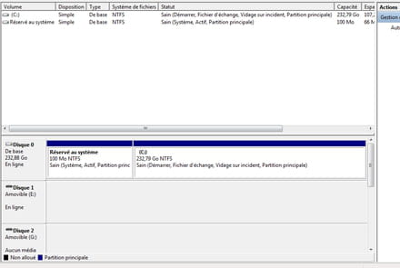 sous Windows 7 : Windows ( Démarrer ) => clic "droit" sur "Ordinateur" => "Gérer" => "Gestion des disques "