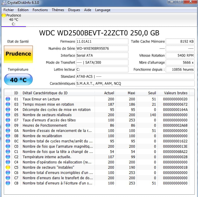 Bonjour . Voir son état de santé via crystaldisk ---> http://www.google.fr/... et me donner le rapport , merci