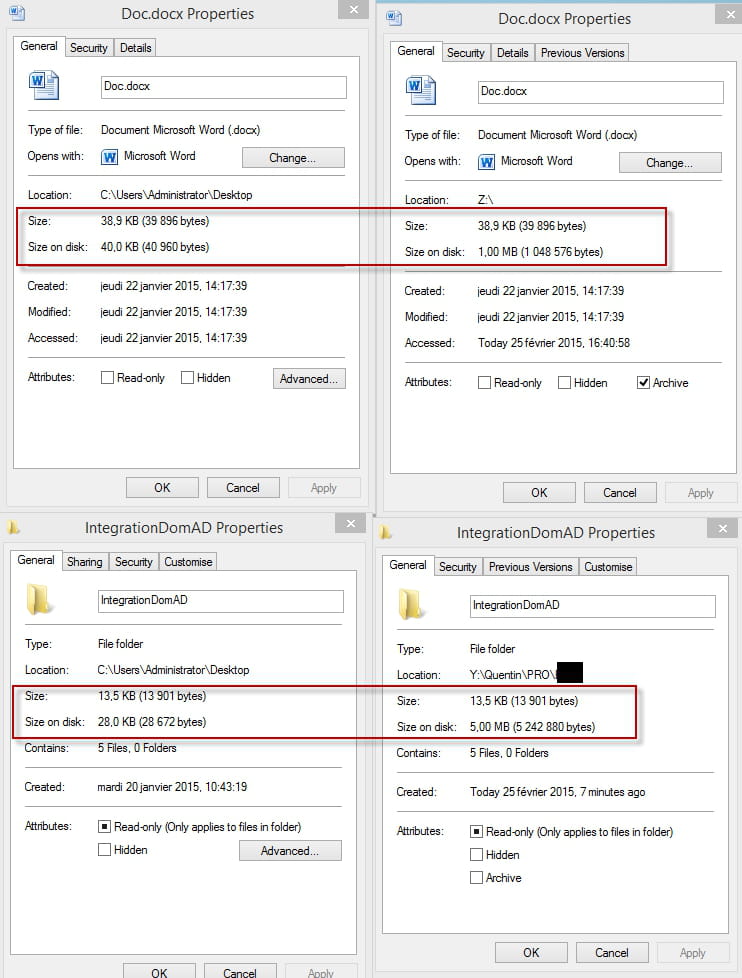Si maintenant on considère le stockage d'un fichier F sur une machine windows et une machine linux (considération indépendante de samba), la taille effectivement occupée peut différer. Cela dépend notamment de la taille de bloc utilisée sur le système de fichiers.