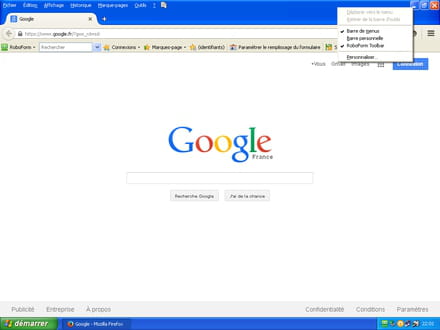 C'est fait, pour afficher la Toolbar de Roboform et sa barre de menus, il faut également faire un " clic droit " dans la zone bleue tout en haut de l'écran, et là il faut cliquer sur " Roboform Toolbar ".