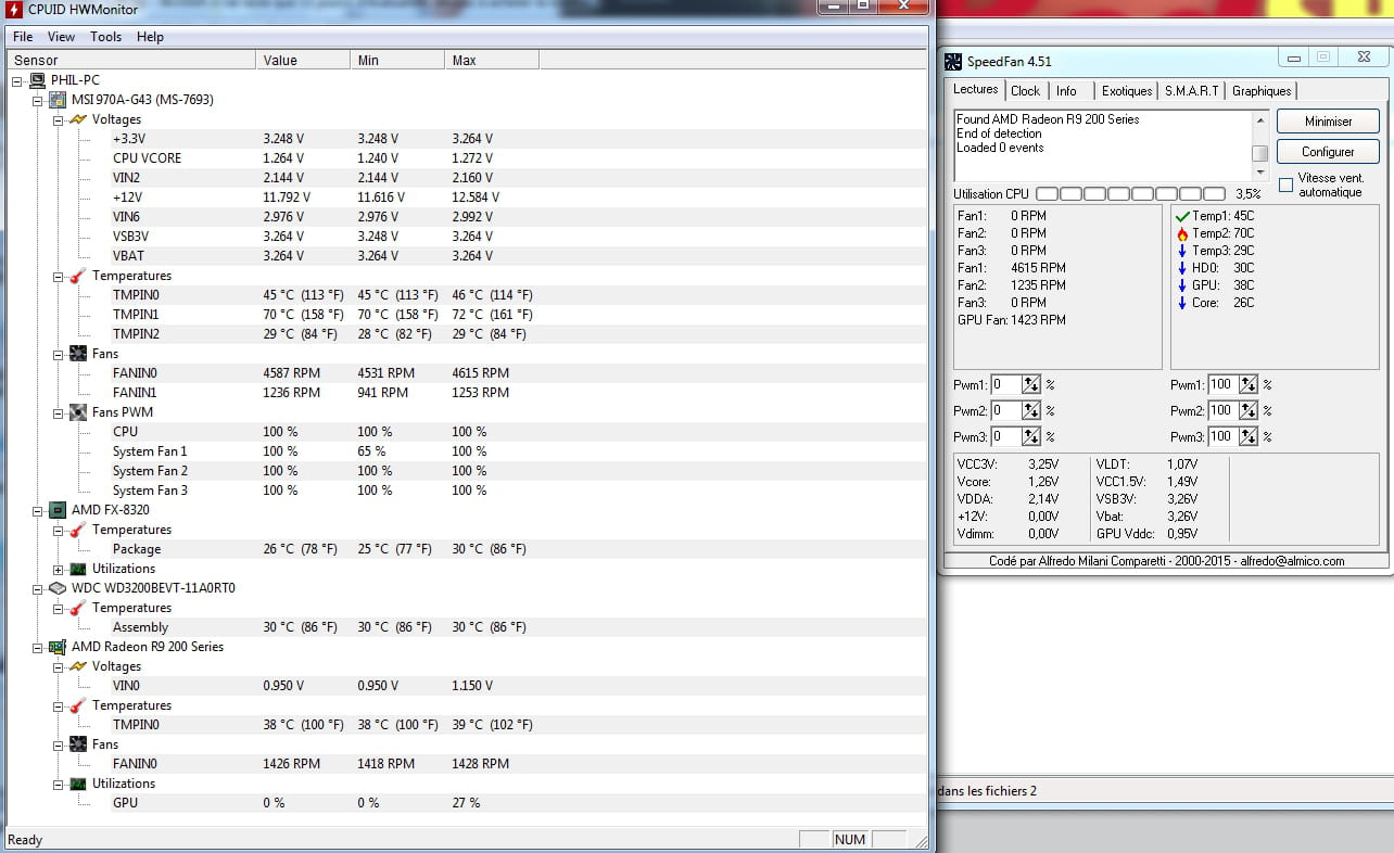 -Après inspection de Speedfan, toutes mes températures sont normales. Ma CG ne dépasse pas 40°, mon DD est à 30°, mon Core est à 30°, lui aussi. J'ai cependant 3 températures dont je ne connais pas la provenance. Temp1, qui est à 40°, Temp2 qui est constamment à 80°, même lorsque je ne fais rien et Temp3 qui est à 30°. J'ai une MSI 970A-G43 comme Carte-mère et impossible de trouver sur internet à quoi correspondent les capteurs Temp 1, 2 et 3.