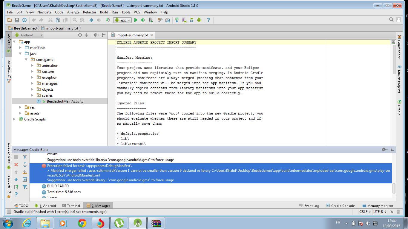 > Manifest merger failed : uses-sdk:minSdkVersion 1 cannot be smaller than version 9 declared in library C:\Users\Khalid\Desktop\BeetleGame3\app\build\intermediates\exploded-aar\com.google.android.gms\play-services\6.5.87\AndroidManifest.xml
