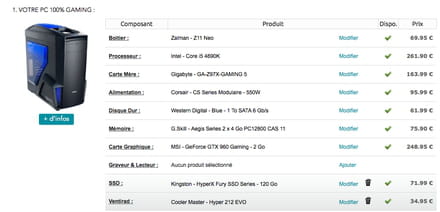 En effet, les prix semblent un peu élevés sur le site où tu as constitué ton pc. Voici ce que je te propose pour un prix identique: