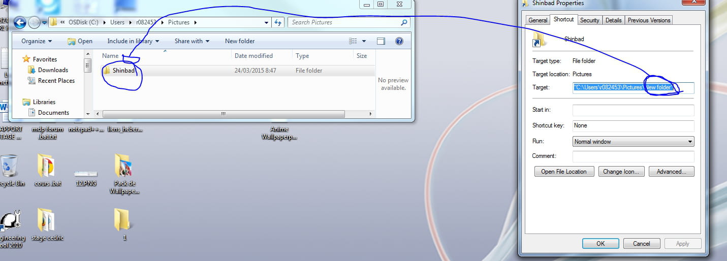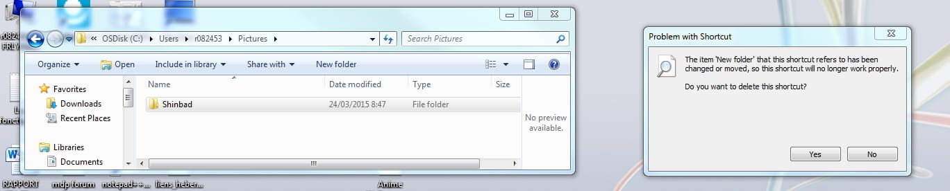 pour accéder o chemin d accer de ton raccourcis clic droit proprieter (sur l image on voite que le chemin d accer n est pas le même que le ou le dossier est le dossier ne s appelle plus new floder mais shinbad il ne trouve donc plus le chemin d accer )Pour régler ton problème il te suffit donc de les réassigné avec un bon chemin d accé !