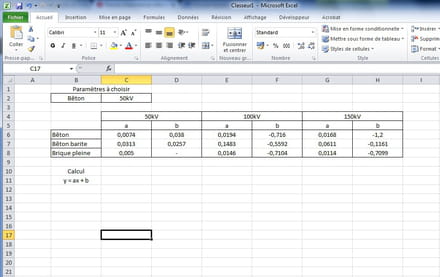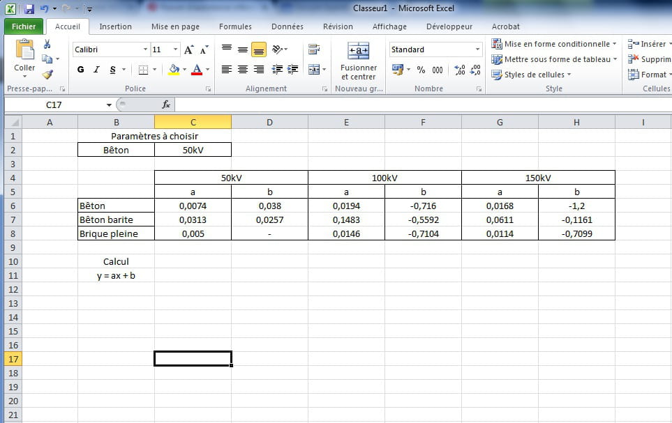 y = 0,0074x + 0,038 (donc pour bêton et 50kV)