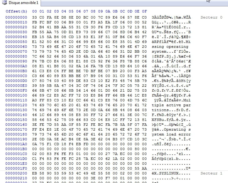 mais en analysant le secteur 0 de la clef j'ai vu que la partition était de type linux