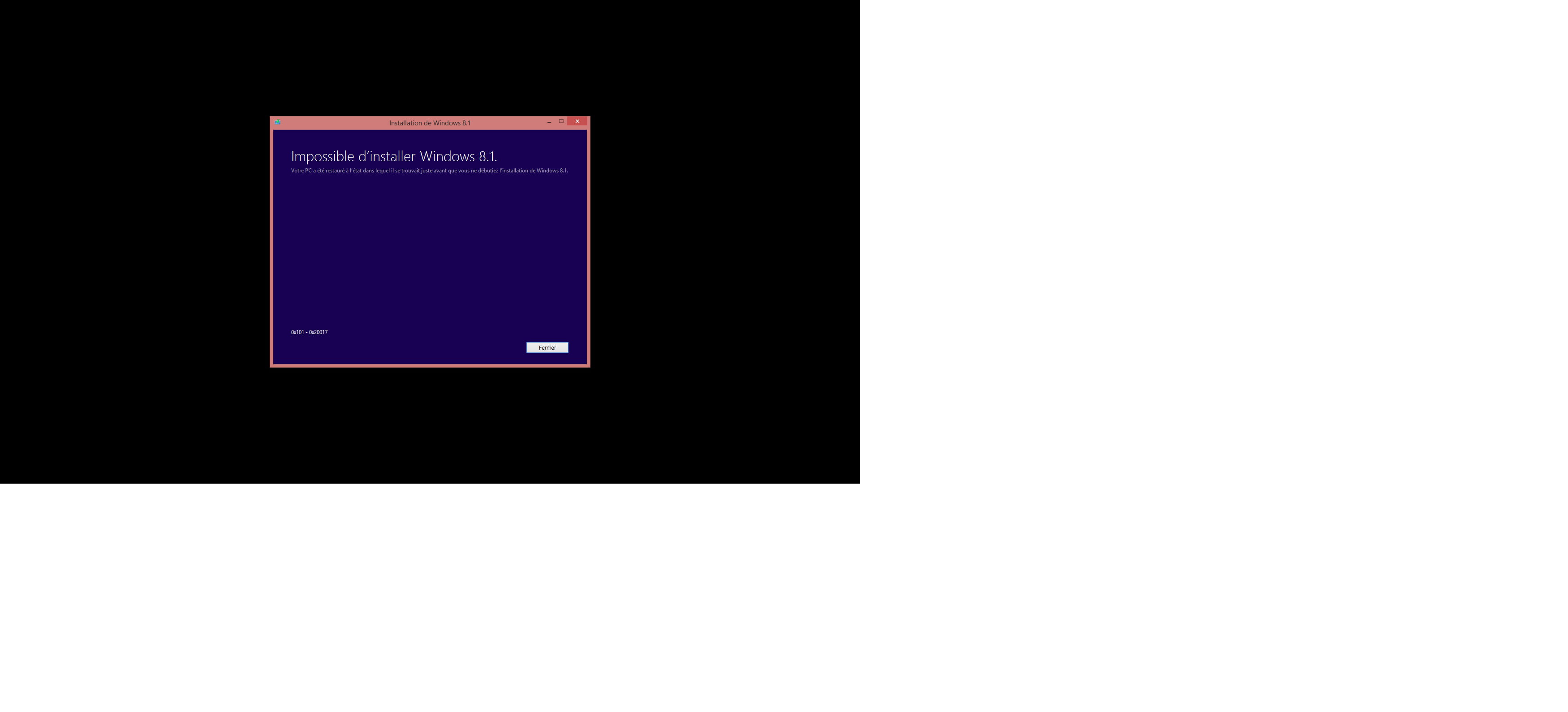Je viens ici vous demander de l'aide car je voudrais faire un formatage de mon pc puisque ça fait plus d'un an que je l'ai et parfois j'ai quelques erreur, mais des que je lance le CD d'installation de Windows 8.1 ça me demande de faire la mise a jour puis âpres je coche la case ne rien conserver, ensuite j'ai l'écran bleu avec le % d'installation, jusque là tout se passe bien mais c'est apres que ça se complique, des que Windows redémarre il y a un message d'erreur qui me dis " Impossible d'installer windows 8.1. avec un petit code en bas a droite et quand je fait annuler ( seule chose faisable ) mon ordinateur reviens comme avant avec tous mes logiciels etc, pouvez vous m'expliquer svp la démarche a faire pour réinstaller Windows 8.1 correctement. Merci.
