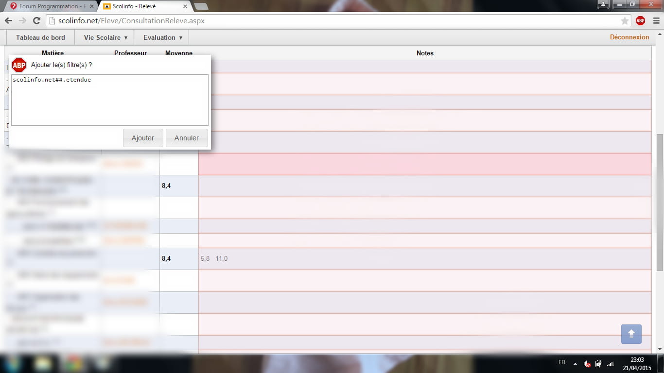 J'aimerai utiliser AdBlock pour bloquer l'affichage de mes notes sur Scolinfo.net