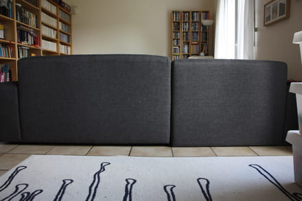 Mais une fois que les livreurs sont partis, je me suis rendue compte que les deux parties du canapé n'étaient pas à la même hauteur! La méridienne repose sur le sol et l'autre partie repose sur un caisson intérieur : tout est en décalage, y compris les crochets qui servent à consolider les deux parties ensemble.