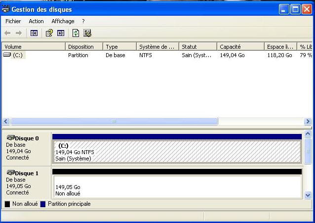 merci pour tout ses renseignements, c'est une tour, avec deux disques,donc celui qui est alloué est vide, adieux mes fichiers ! c'est un disque qui n'a pas eu de partitions, un de mes copains l'a formaté a tout les coups, pour avoir la totalité des 149 go quelle partitions que je dois utilisé, la principale ou l'étendue, la taille de paritions que je dois y inscrire, tout ça pour moi et nouveau ? Un grand merci.
