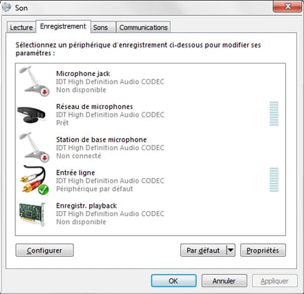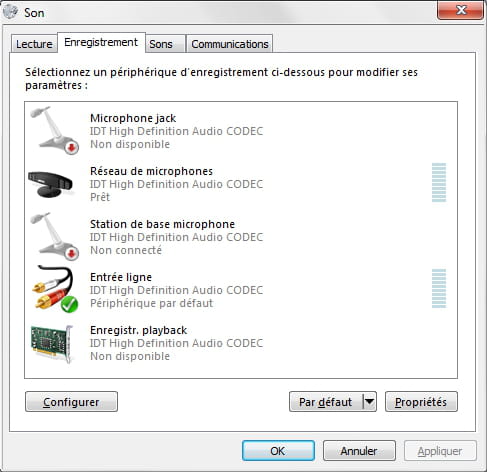 Je rencontre actuellement un petit problème avec mon Windows 7. J'ai acheté un micro pour mon ordinateur qui se branche via la prise Jack. Mon ordinateur détecte bien que je branche mon micro et l'ajoute comme périphérique d'enregistrement par défaut mais pourtant, aucun son n'est enregistré. J'ai alors testé avec un autre micro jack et il ne marche pas non plus. Il doit y avoir une manipulation à faire certainement mais je l'ignore. J'ai vérifié que les drivers soient à jour.