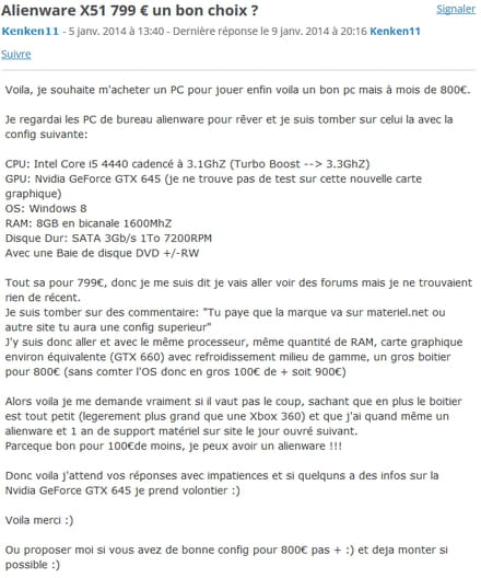 Bonjour ! Voila je "convoite" de m'acheter un Alienware X51 d'occas' mais "comme neuf" , a 460 euros , je me demande si il sera bien ou pas (à ce prix la ...)