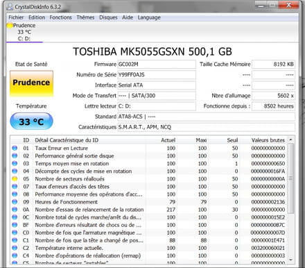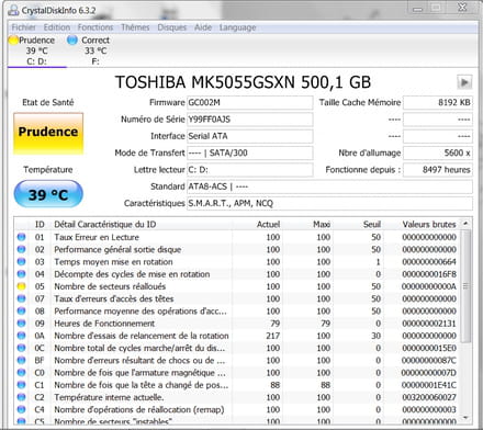 j'ai alors lancé crystal disk info, et le voyant est 'jaune' et indique 'prudence'.