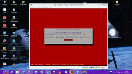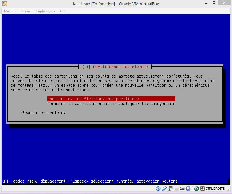 Si j'annule, il y a un écran bleu qui s'affiche et plus rien ne se passe, j'ai plus qu'a fermer la VM et recommencer, et si je fait "Terminer le partitionnement et appliquer les changement, j'ai ça :