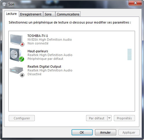 En fait j'ai 2 haut-parleurs : un est périphérique par défaut (EPSON projector UD audio device) : un vidéo projecteur que j'ai déjà connecté à l'ordinateur
