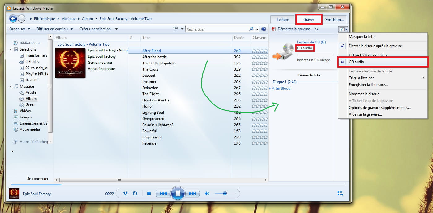Pour ton CD, il faut que tu le graves, par exemple, avec Windows Media Player :