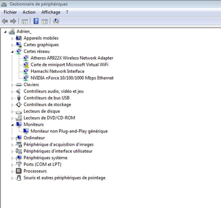 D'accord, tu devrais aller dans le gestionnaire de périphériques, faire un clic-droit sur le truc tout en haut (c'est ton nom d'utilisateur) et faire rechercher les modifications sur le matériel