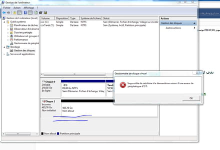 lorsque je clic sur initialiser le disque j'ai cette message dans la photo "impossible de satisfaire à la demande en raison d'une erreur de périphérique d'e/s"