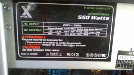 Mon alimentation est de marque MadX 550W. Voilà une photo de l'alimentation : (excusez la piètre qualité)