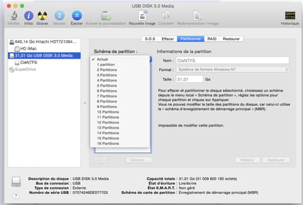 Si tu vas dans Utilitaire de disque, mais cette fois sur l'onglet Partition, as-tu accès au sous menu Actuel... ? il faut sélectionner la clé physiquement, pas sa partition existante...