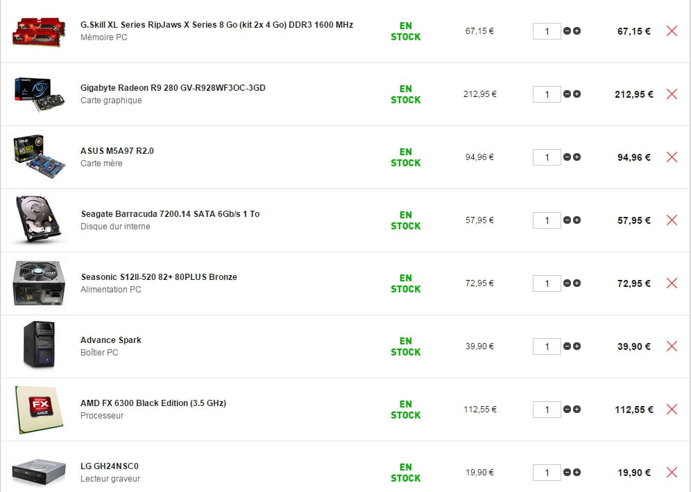 Les RAM se font en dual channel donc il vaut mieux 2 barrettes de 4Go au lieu d'une de 8Go. Ensuite je te conseille vivement un processeur Intel car il est livré avec un ventirad et un pâte thermique et t'es sûr de ne pas avoir de problèmes de driver. Ton écran se branche en VGA ce qui va te donner une qualité pourrie. ^^ Ta carte mère coûte beaucoup trop cher et enfin il manque encore Windows (ce qui fait qu'il vaut en réalité 930€). Mais je comprends pas, je t'ai fais une bonne config à 775€ avec un PC, un écran et Windows... Et je crois que c'est le mieux que tu puisses avoir à ce prix là :)