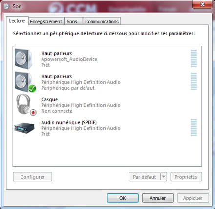 J'ai regardé dans le panneau de configuration > son, mais que je le branche ou pas rien ne change.