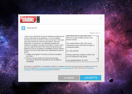 La ou est écrit "JE REFUSE" et "J'ACCEPTE" il m'est impossible de cliquer dessus. Rien ne ce passe. Mais toute les petite écriture bleu, ou les cases a coché sa focntionne. Et sa me fait sa pour chaque fenêtre de ce type ... S'il vous plait si quelqu'un a une solution aidez-moi *_*.