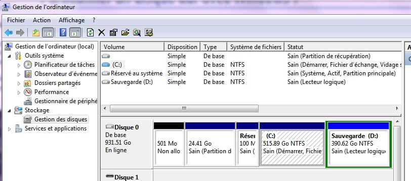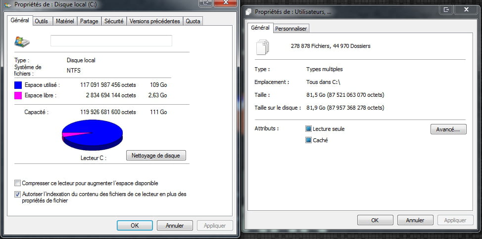 à gauche c'est les propriétés de mon SSD il m'indique qu'il me reste 2,63Go car 109 Go sont utilisés !
