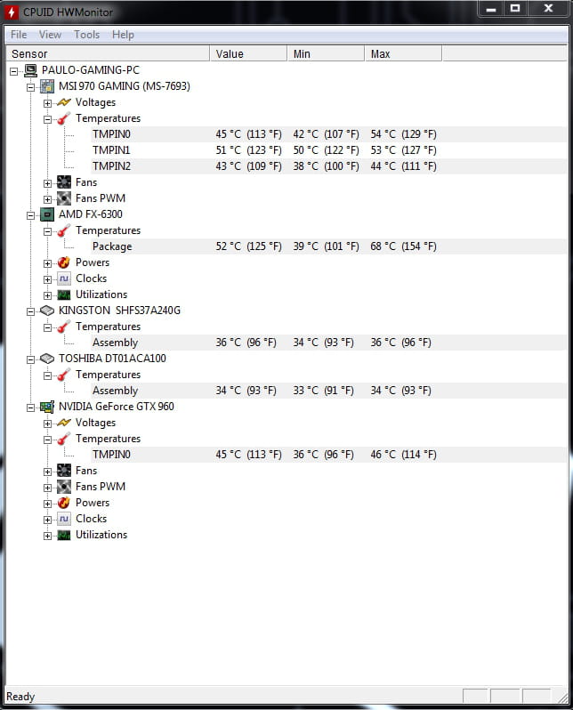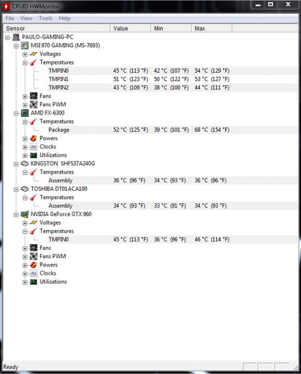 Mon ordinateur neuf, monté il y a moin d'une semaine a un problème enorme de chauffe. Je trouve les valeurs du processeur et carte grafique beaucoup trop élévée. En ce moment l'ordinateur fonctionne ouvert et voici les valeurs qu'il me donne (sans jouer a des jeux vidéos)