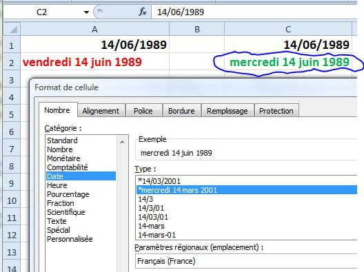 au format *mercredi 14 mars 2001, le deuxième de la liste des formats DATE, et qui s'aligne à droite de la cellule A2,