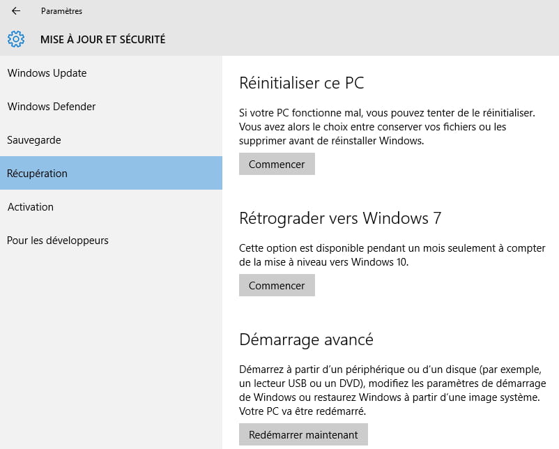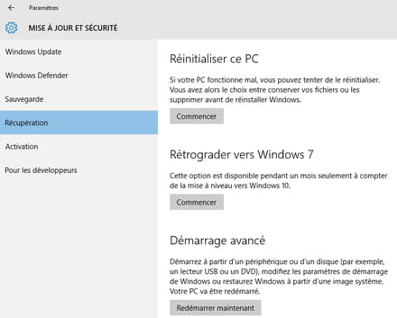 Si l'installation de Windows 10 est une réussite mais que le système d'exploitation ne te convient pas pour raison X ou Y, tu as la possibilité de revenir sur Windows 7 via le menu Démarrer => Paramètres.