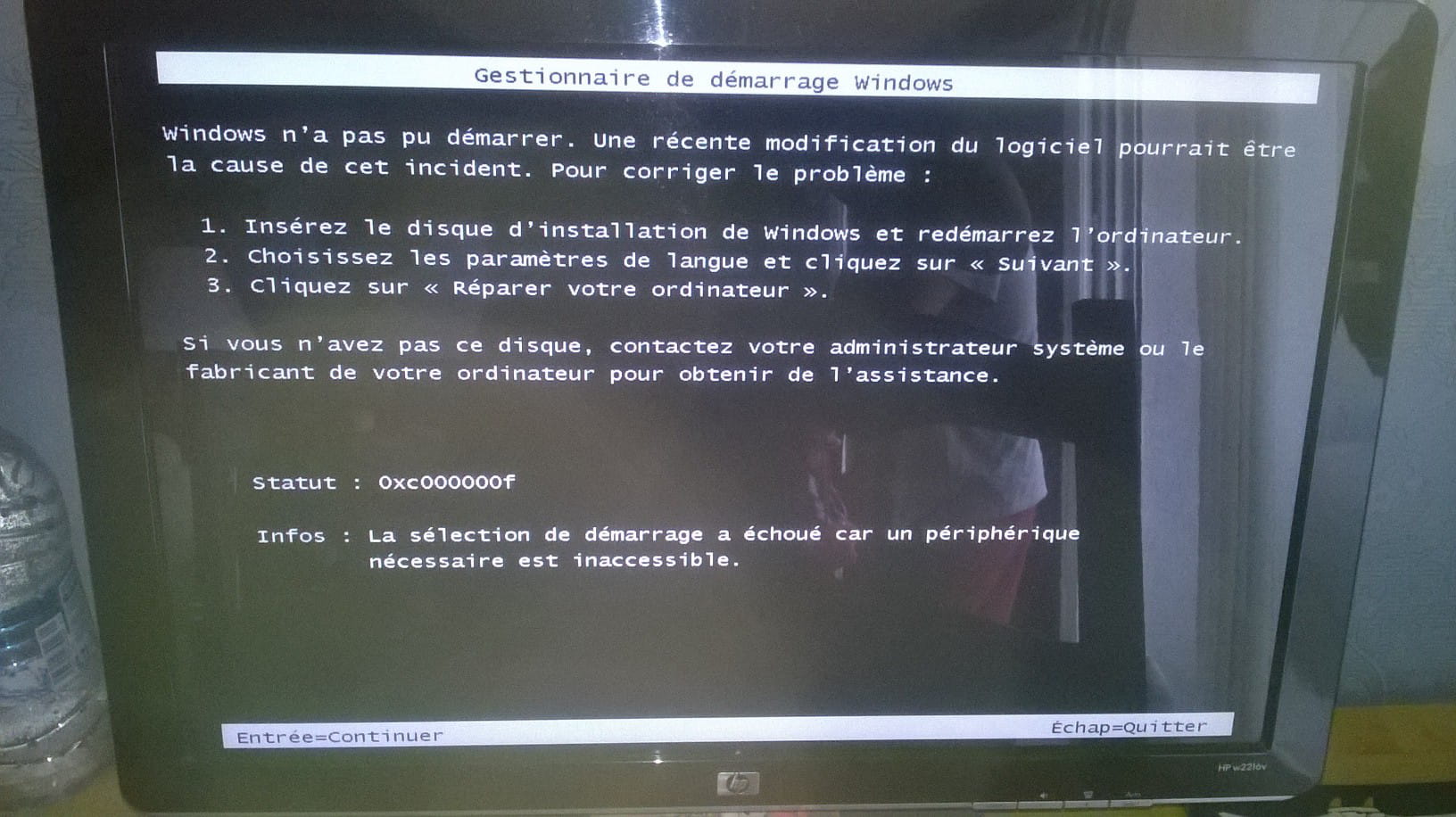 quand je l'ai rallumer il a plus voulu démarrer il me disait que windows n'était pas installer et me demandait le cd d'installe que je n'ai pas je ne pouvait rien faire ni f8 rien j'ai fait des recherche et tout ce qu'on l'on me proposait je ne pouvait pas le faire car je n'avait que ce foutu ecran noir avec la pointe de la souris