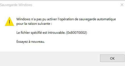 Bonjour, j'ai installé W 10 sans aucun problème il y a 3 jours, à présent, impossible de terminer une sauvegarde, "erreur (0x80070002)" et tout s'arrête...Est-ce que quelqu'un connaît la marche à suivre pour réaliser la sauvegarde ou pour éviter cette erreur, merci d'avance aux spécialistes (que je ne suis pas!).