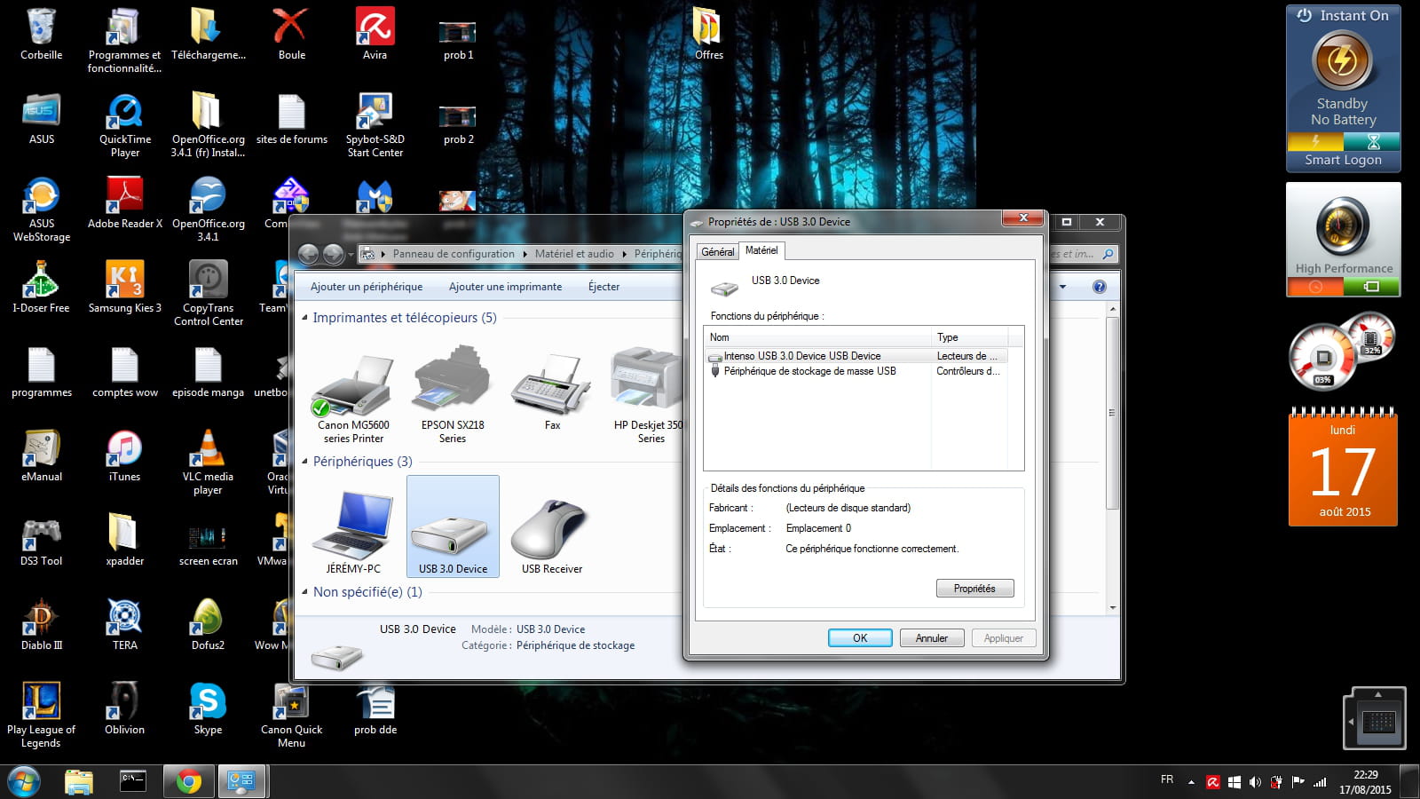 2) Il est reconnu (bip sonore du pc) apparaît dans les périphérique et imprimante sous le nom "device 3.0" (donc pas son vrai nom: Intenso) mais n'apparaît pas dans le poste de travail