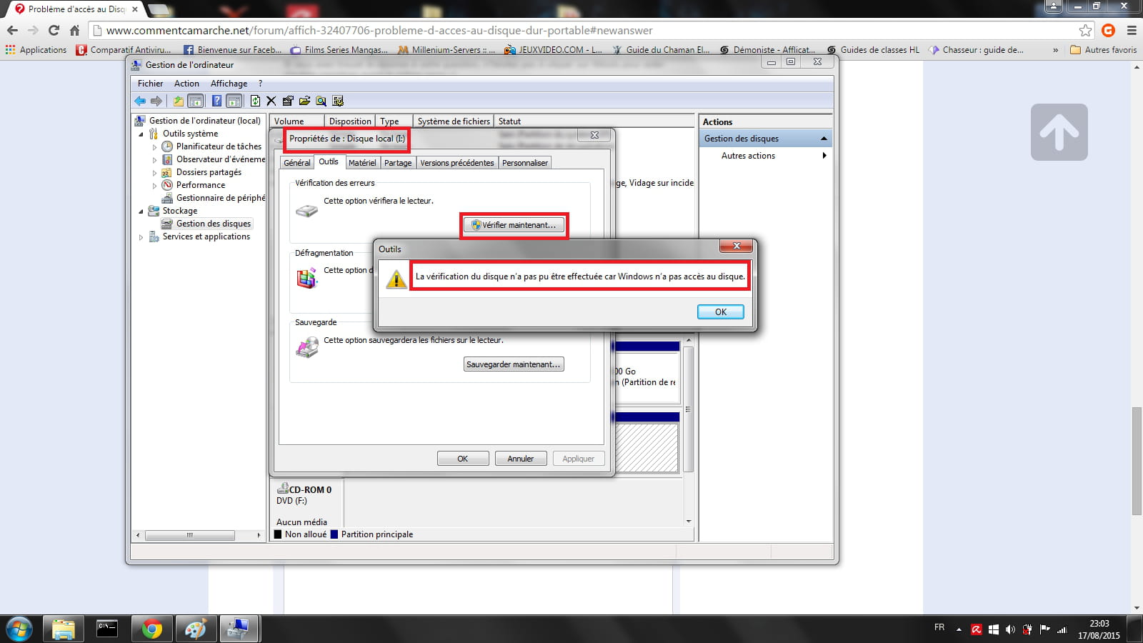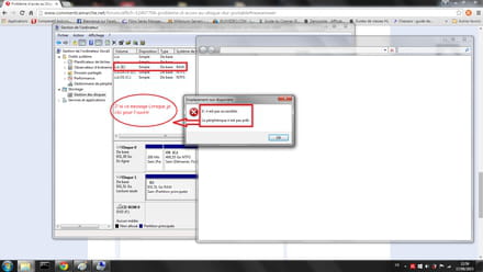 2) Ouvrir Windows clic droit sur "Ordinateur" > "Gérer" > "Gestion des disques" mais là rien n'apparaît à part mes disques locaux sauf dans le cas (3) ci-dessus ou "disque local I" apparaît en me demandant "Initialisé le disque" mais lorsque je clic sur OK il me dise que le disque est occupé ou inaccessible (je sais plus vraiment) ou il demande un formatage mais ça c'est pas envisageable.