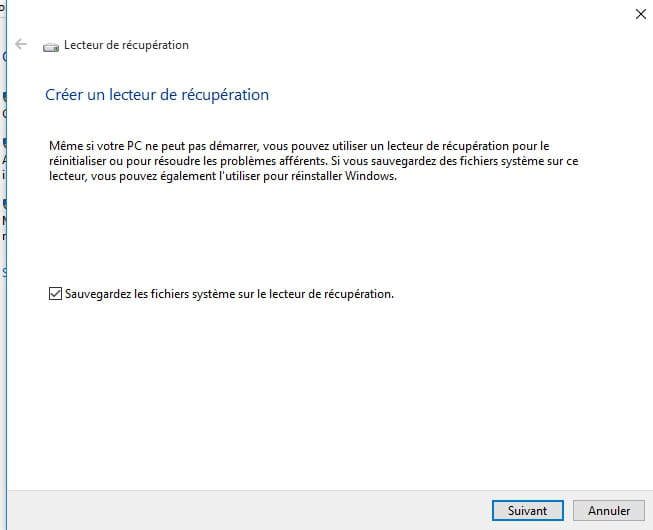 5. Précise-moi si, depuis ton W10, l'option "insérer les fichiers systèmes" est grisée lorsque tu choisis de créer un support de récupération.