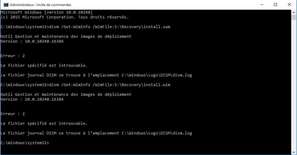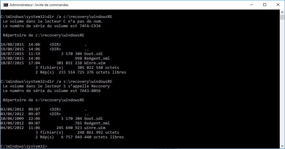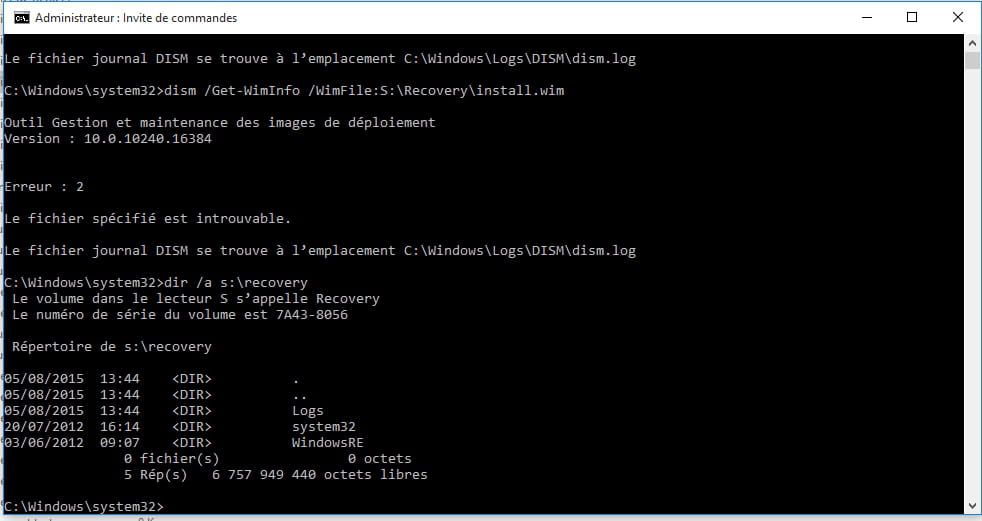 Bon, je m'appuie sur ton diskpart et sur le fait que la partition recovery est associée à la lettre E (vérifie-le). Tu vas me donner le résultat de la commande suivante :