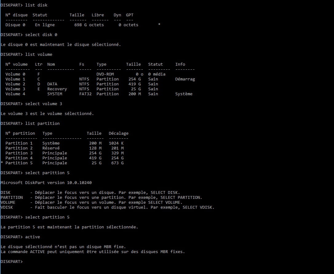 DISKPART>active ( c'est fini la partition est activée, tu quittes diskpart avec la commande exit deux fois)