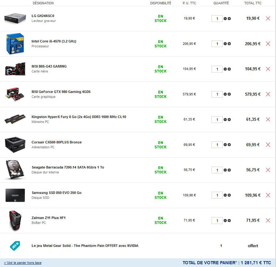 Sinon j'ai modifié la carte graphique (pour une MSI Gaming Silent), le ventirad pour un plus performant et surtout l'alim (si tu OC tu auras besoin d'un peu plus de marge, donc j'ai mis la B700 V2).