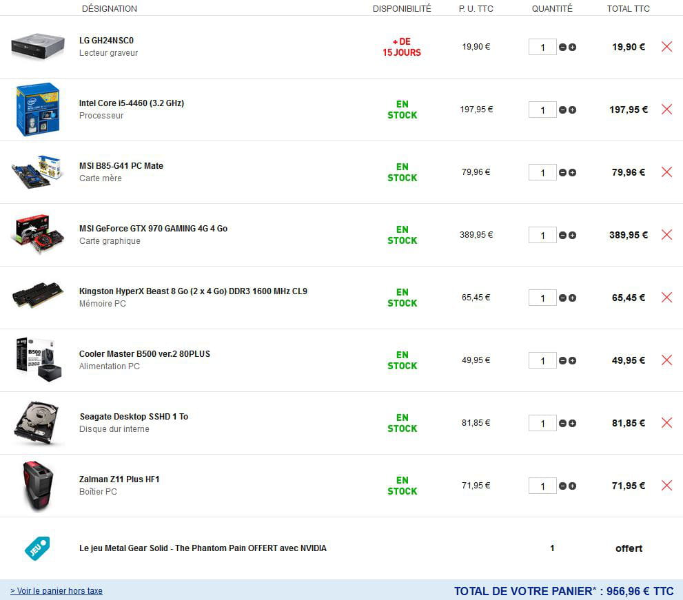 Salut ^^ Ta config est mal optimisée et il manque Windows, je te proposes ça à 955€ sans Windows et sans la carte WiFi (je te conseilles celle-là https://www.ldlc.com/fiche/PB00184015.html )