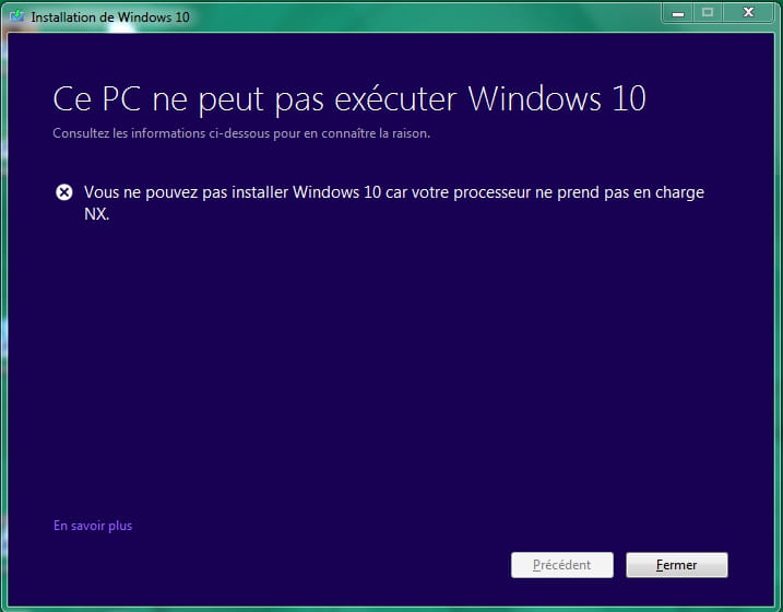 Je n'arrive pas à installer Windows 10, même en forçant l'installation avec le "MediaCreationTool", car il me dit que mon CPU n'est pas compatible avec NX :