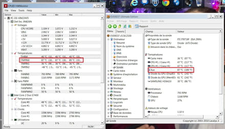 voici les temperatures relevées avec 2 locigiel everest et HWmonitor, je ne sais pas a quoi correspond les valeurs en rouges.