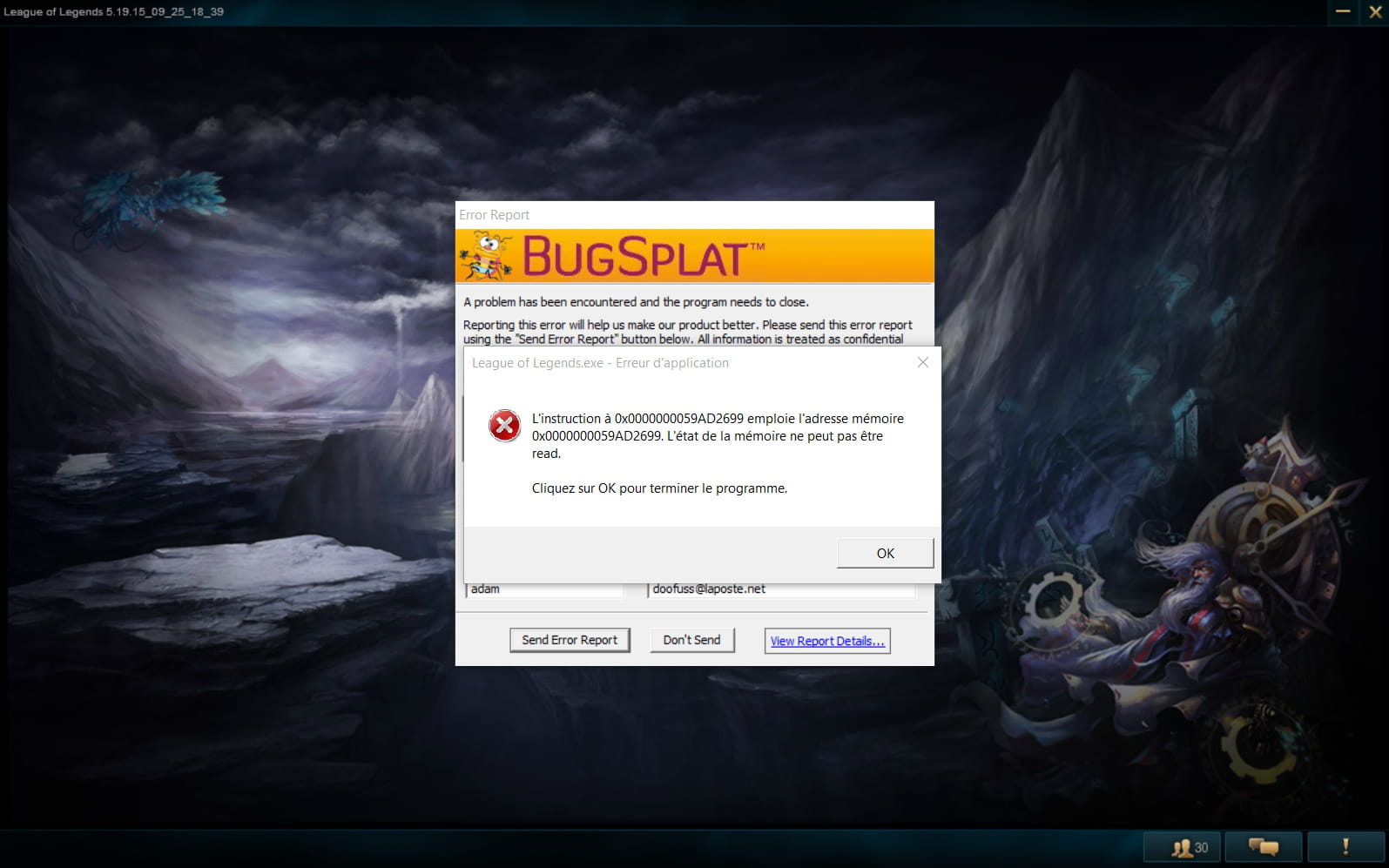 J'ai essayer de me connecter a une partie en créateur d'équipe hier , le jeu a planter , et a chaque fois que j'ai essayer de me reconnecter il plantais toujours , j'ai donc désinstaller et réinstaller league of legend sur mon ordinateur , j'ai réessayé de me connecter après ça mais au cas ou en partie personnalisée ou j'étais seul , j'ai bien fait car sa n'as toujours pas marché , j'ai relevé le message que sa m'as indiquer avant que la fenêtre bug splat s'ouvre : "L'instruction à 0x00000000600F2699 emploie l'adresse mémoire 0x0000000600F2699.