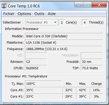 J'ai fais CoreTemp, voici le screen: