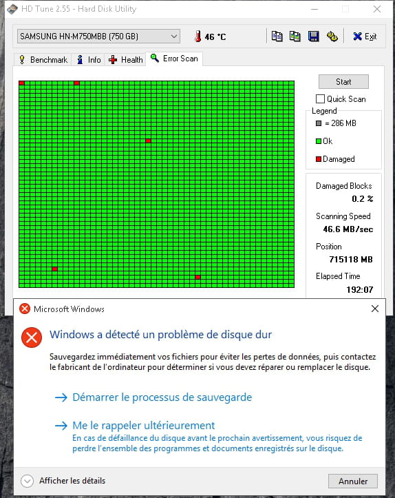 Ton disque dur a l'air sacrément mal en point ! C'est un PC portable ? tu le déplaces sans l'éteindre ?