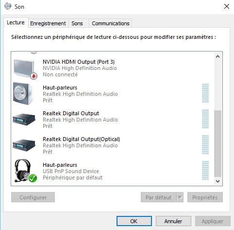Quand ton casque est branché, vas sur cette capture pour paramétrer le périphérique par défaut (rond vert).