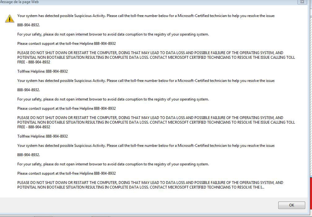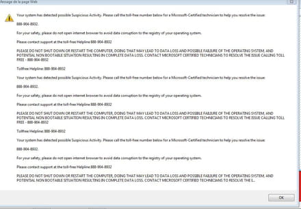 n'appelez pas le numero (surtaxé et aux états unis), essayez d'installer avast ou un autre anti-virus gratuit et si le probleme persiste rendez-vous chez un informaticien de votre quartier pour une desinfection.