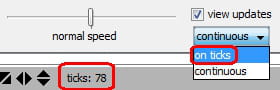 Mais comme je l'indiquais hier la vue "on ticks" est plus pertinente puisqu'elle affiche l'état de la simulation qu'une fois chaque étape terminée avec tous les changements d'un coup (donc moins souvent).