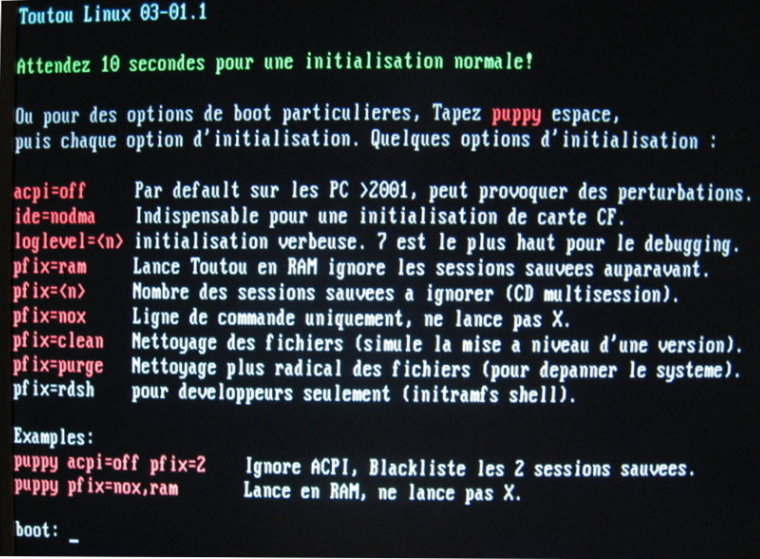 *Tu redemarres avec le CD ToutouLinux dans le tiroir (peut etre inverser l'ordre de boot du demarrage pour qu'il se lance, sur Acer ca devrait etre F 12 ou l'indication qu'il y a sur le logo ACER du demarrage)